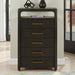 The Sigmund 5-Drawer Chest adds a touch of modern-rustic sophistication to the bedroom with its graceful, elongated profile. Crafted from oak veneers and solid Asian hardwoods in a rich sable finish, it delivers durable, spacious storage through five English-dovetailed drawers that open with smooth, secure glides. Subtle design elements—like the collection’s softly rounded edges and sculpted corners—enhance its warm, refined character, making the chest both a practical storage piece and an eye-catching design statement.