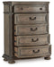| Details | Made with hardwood solids, oak and ash veneer, MDF substrates and cast resin components, Top with inlaid ash veneer border, Light brown finish with glazed antiqued look, Metal hardware with aged bronze-tone finish, 5 drawers with fully finished interior, dovetail construction and heavy duty ball-bearing side glides (top drawer felt lined) | |