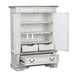 Blending of European traditional design influences makes Abbey Park a truly unique style for any living space. Warm antique finishes and artistic distressing along with grand scale makes Abbey Park a group to be passed to generations. The antique white finish with heavy chipping combines with the weathered brown white wash tops for a truly unique look. Bail and drop ring hardware in antique pewter add the finishing touch to the cases.