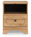 Country rustic. Vintage inspired. However you see it, you’re sure to be charmed by this nightstand. Adorned with a chic drawer knob and a warm oak grain finish, it offers a relaxed mix of picturesque aesthetics. Its storage space gracefully welcomes bedside necessities. And built-in USB charging adds a dose of modern convenience, keeping your devices powered up from dusk to dawn. With an air of easygoing elegance, this piece lets you drift away to a simpler time and place.