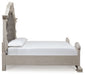 Inspired by the grandeur and grace of European traditional style, this opulent king upholstered panel bed is nothing short of stunning. Ornate sculptural details and button-tufted fabric on the impressive headboard and footboard are sure to make a sophisticated statement in your restful retreat. A timeless antiqued white coloration lends an air of subtle elegance to this sumptuous bed.