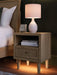 Clean-lined and contemporary—but far from stark—this nightstand is a fresh style awakening. Pairing a light finish with replicated oak grain and textured beige details that replicate the look of cane, its mixed materials bring a naturally versatile vibe to your bedroom. Sleek, simple hardware plays perfectly with the modern aesthetic. A smooth-gliding drawer and USB charging keep your clutter contained and your gadgets powered. Warm LED lighting not only illuminates your restful retreat but also adds a touch of unmatched style.