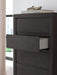 Details PCB3370B9: Includes headboard panel, headboard posts, storage footboard and rails, Made with engineered wood (MDF/particleboard/plywood) and decorative laminate for the right balance of affordability and durability , Dark charcoal finish over replicated oak grain, Decorative laminate replicates natural or man-made material surfaces with consistent color, pattern and texture, 2 smooth-gliding drawers in footboard, Foundation/box spring required, sold separately, Mattress available, sold separately, Assembly required, PCB3370B1: Includes dresser and mirror, Made with engineered wood (MDF/particleboard/plywood) and decorative laminate for the right balance of affordability and durability , Dark charcoal finish over replicated oak grain, Decorative laminate replicates natural or man-made material surfaces with consistent color, pattern and texture, Recessed hand grabs create hardware-less effect, 6 smooth-gliding drawers, Drawer interiors are lined with a faux linen laminate for a clean, finished look , Safety is a top priority, clothing storage units are designed to meet the most current standard for stability, ASTM F 2057 (ASTM International), Drawers extend out to accommodate maximum access to drawer interior while maintaining safety, Mirror attaches to back of dresser; can also be mounted on wall horizontally or vertically, Assembly required, PCB3370-46: Made with engineered wood (MDF/particleboard/plywood) and decorative laminate for the right balance of affordability and durability, Dark charcoal finish over replicated oak grain, Decorative laminate replicates natural or man-made material surfaces with consistent color, pattern and texture, Recessed hand grabs create hardware-less effect, 5 smooth-gliding drawers, Drawer interiors are lined with a faux linen laminate for a clean, finished look, Safety is a top priority, clothing storage units are designed to meet the most current standard for stability, ASTM F 2057 (ASTM International), Drawers extend out to accommodate maximum access to drawer interior while maintaining safety, Assembly required, PCB3370-92: Made with engineered wood (MDF/particleboard/plywood) and decorative laminate for the right balance of affordability and durability, Dark charcoal finish over replicated oak grain, Decorative laminate replicates natural or man-made material surfaces with consistent color, pattern and texture, Recessed hand grabs create hardware-less effect, 2 smooth-gliding drawers, Drawer interiors are lined with a faux linen laminate for a clean, finished look, 2 slim-profile USB-C charging ports, Power cord included; UL Listed, Assembly required,
