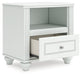 | Details | Made with engineered wood (MDF/particleboard/plywood) and decorative laminate for the right balance of affordability and durability, Matte white finish, Decorative laminate replicates natural or man-made material surfaces with consistent color, pattern and texture, Crystal drawer knob, 1 smooth-operating drawer, Drawer interior is lined with a faux linen laminate for a clean, finished look, Open shelf, USB-A and USB-C charging ports, Pink, purple and white LED lighting options; touch button control, Power cord included; UL Listed, Minor assembly required | |