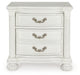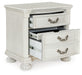Transform your inner sanctum into a haven of timeless elegance and functionality. This traditionally styled nightstand is adorned in a classic antiqued white finish, highlighted by a serpentine-shaped front with thick decorative moulding. Its drawers are packed with ample storage possibilities, and a hidden pull-out tray behind the bottom drawer puts your small valuables out of sight. And did we mention the stylish reeded bun feet? Talk about relaxed refinement.