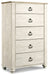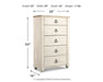 | Details | Made of engineered wood (MDF/particleboard) and decorative laminate, Whitewash replicated worn through paint with authentic touch, Replicated wood grained block pattern with authentic touch, Antiqued brass-tone ring-pull hardware, 5 smooth-gliding drawers, Safety is a top priority, clothing storage units are designed to meet the most current standard for stability, ASTM F 2057 (ASTM International), Drawers extend out to accommodate maximum access to drawer interior while maintaining safety, Assembly required | |