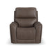 Power up and enjoy secretive perks with the Carter power recliner. Customize your comfort with adjustable recline, headrest and lumbar support, including reclining to a Zero Gravity position for a weightless experience, reducing pressure on joints. This recliner will be a statement in your home with its genuine leather look that is a durable, easy to clean fabric in a cappuccino brown color, and Flexsteel's patented Blue Steel Spring™ at the heart of its seat for ultimate durability. Flared arms, a contoured seat and heavy thread stitching details give it a sleek, yet striking look. And it all comes with pop-out cupholders in the arms for discreet storage.