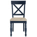 he Darcy Side Chair brings timeless charm with its modified Napoleon X-back design, blending traditional elegance with modern versatility. A two-tone finish pairs deep midnight blue with a natural wood seat, highlighting the wood grain’s warmth. Turned front legs add farmhouse character, while clean lines keep it fresh and contemporary. The contoured seat ensures comfort and durability, perfect for family meals or casual gatherings. Ideal for dining rooms, kitchens, or breakfast nooks, the Darcy Chair effortlessly combines style and function.