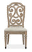 Rooted in Old World design with an updated and relaxed soft Fawn finish, it's hard to surpass the appeal of the elegant Marisol dining collection. Reminiscent of garden gates, a recurring design element is metal fretwork in a graphite finish on case doors and scrolled metal decoration on the hutch, dining curio and the pedestal base of the 65-inch round dining table. Crafted of Pine Solids, timeless and gracious style elements include fluted pilasters, intricate carvings, a shaped foot and dramatic arch shapes on the curio, hutch and huntboard. Three stunning dining case pieces are offered including a buffet curio, buffet with hutch and a huntboard top featuring diagonal planking behind the 3 wood shelves with plate grooves. The three dining tables include a rectangular table, trestle table with a bottom metal stretcher with rosette decorations and the 56-in round table with metal scrolls on the pedestal base. Dining side chairs include two upholstered-seat chairs, one with a wood fretwork back and one with an upholstered back. Beautifully-scaled host chairs in a classic upholstered wing style are offered with a leg or skirt option. Elevate your interiors with the refined style of Marisol.