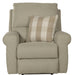 The WESTPORT power lay flat recliner features a Farmhouse Casual style with its Greek Key arm treatment, soft body fabric, and an accent pillow.