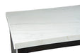 A modern take on dining, the Westby features a stunning white marble top with hints of black mineral accents that coordinates beautifully with the ebony pewter nailhead trim chairs and bench.