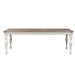 Create a grand gathering with the Magnolia Manor table set, consisting of upholstered splat back side chairs and a rectangular leg table. Crafted of poplar solids with cathedral white oak veneer, this kit features an antique white finish with heavy chipping and a weathered brown top with whitewash. The table offers a fancy face top, canted corners, two 18" leaves to easily accommodate guests or a large family and is anchored by faceted turned legs. The chairs feature the perfect blend of European design with upholstery in ivory tweed chenille, dog bone accents on the splat back, tufted back panel, nylon chair glides to protect your flooring, and beautifully faceted turned legs. Warm antique finishes and artistic distressing along with grand scale create a piece to be passed to generations.