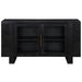 The Reid 60" Server offers a modern take on a versatile dining and entertainment piece. Its rich midnight black finish over ash veneers delivers a bold, refined look for any room. Two glass doors provide display, storage, and easy remote access, while two adjustable interior shelves customize space for décor or electronics. Convenient charging is built in with two electric outlets plus USB-A and USB-C ports on the outer upper back, paired with a wire escape for organized cords. Clean lines complete the look overall.