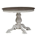 Create a grand gathering with the Magnolia Manor optional five-piece pedestal table set, consisting of four splat back upholstered side chairs and a pedestal table. Crafted of poplar solids with cathedral oak veneer, this kit features an antique finish with heavy chipping and a weathered top. The table offers one 12” leaf to accommodate guests or a larger family and is anchored by a turned pedestal base. The chairs feature the perfect blend of European design, upholstery in tweed chenille, dog bone accents on the splat back, tufted back panel, nylon chair glides to protect your flooring, and beautifully faceted turned legs. Warm antique finishes and artistic distressing along with grand scale create a piece to be passed to generations.