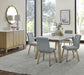 Experience the essence of minimalism, functionality, and beauty with the Vida 5-Piece Marble Dining Set, which showcases the sleek design of mid-century modern and Scandinavian styles. The centerpiece of the set is a stunning 72-inch marble top table, supported by canted burnished blonde solid hardwood legs, creating a marvel of elegant design simplicity. The table is complemented by four gray fabric modern chairs, gently shaped for both comfort and style, which offer plush seating, encouraging guests to linger for longer conversations. The set can be further extended with an optional server that features soft-touch doors, adding an element of contemporary elegance to the overall aesthetic.