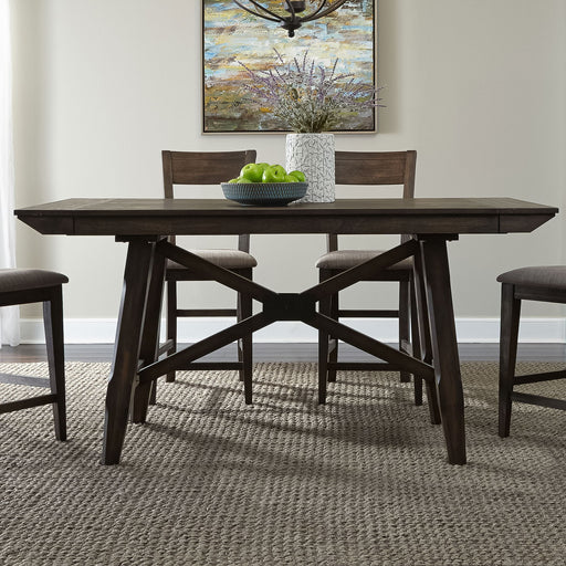 Liberty FurnitureLong and narrow is a great space saving feature in the Double Bridge dining collection. The X Trestle Base combined with the dark chestnut finish d...