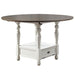 Classic farmhouse styling is updated for today's dining with the Joanna Two-Tone Round Counter Height Dining Table. Sturdily constructed from hardwood solids and acacia veneers with a two tone dark oak/ivory finish. This 59 inch round table is packed with features the entire family will love starting with a double-drop leaf top that expands to seat up to eight. At the heart of the table-top is a lazy susan that makes serving dinner much easier! The turned leg counter base features a drop-down storage compartment for easy storage. Your purchase includes one counter height dining table.