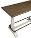 - Styling details include plank-effect top, double pedestal base and metal galley rail