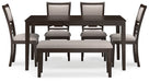| Details | Includes dining table, 4 upholstered chairs and bench, Table made with rubberwood solids, mindi veneer and MDF substrates, Chair and bench frames made with solid wood and engineered wood, Cherry brown finish, Tabletop has reverse diamond patterned veneer, Table with tapered legs, Chair and bench with light beige polyester upholstery, Foam cushioned seat and backrest, Chair backrest features fretwork accent, Seats up to 6, Assembly required | |