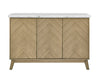 Clean modern lines and a knife edge marble top are the hallmarks of the Vida Marble Top Server. Soft touch doors are free of distracting hardware pieces creating a streamlined profile that allows the burnished blonde finished ash veneers to show through in a striking chevron pattern. But the beauty is not just skin-deep, behind the soft close doors are three adjustable shelves to accommodate bottles and storage of different heights allowing the perfect hidden storage for dining items. Whether in a dining, hallway or as an accent piece, the Vida Server offers clean modern style to accessorize any room.