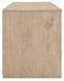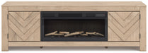 This TV stand with electric fireplace embraces a classically charming aesthetic and repurposes it for modern living. Its light replicated wood grain appeals to your love of vintage character, while the chic chevron pattern is effortlessly on trend. Media accessories stay tucked away in style with hidden storage behind the doors. And for added ambiance, the electric fireplace brings a cozy-cool vibe to your living room. With the touch of a button, activate the LED-lit flame and adjust the temperature or the flame brightness. The flame effect includes multiple color options and a realistic-looking faux birch log set.