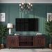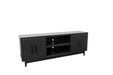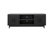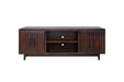 Sophisticated, modern style doesn't get better than the Radiance TV Stand Console. Artfully crafted from Poplar Solids and Okume Veneers, this showstopping Entertainment Center is available in two rich finishes and includes Matte Black Hardware. The cabinet rests atop a sleek wood base with tapered legs and will accommodate TVs up to 85 inches. Two stunning fluted doors conceal interior storage and open center shelving includes cable management openings on the back panel to keep media and gaming console wires organized and out of sight. Fully Assembled upon arrival, this piece is ready to unbox and enjoy. Pair with the matching Bookshelf Piers to create a complete Entertainment Wall.