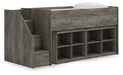 | Details | Includes loft bed, left storage steps with loft ends, roll slats and 2 loft bookcases, Made with engineered wood (MDF/particleboard/plywood) and decorative laminate for the right balance of affordability and durability, Rustic warm gray finish over replicated oak grain with authentic touch, Decorative laminate replicates natural or man-made material surfaces with consistent color, pattern and texture, 8 storage cubbies, Bed does not require additional foundation/box spring, Mattress available, sold separately, Assembly required | |