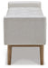 Contemporary style gets practical with this bench. The tufted beige seat cushion is hinged to allow easy access to whatever you need to hide in plain sight. Raised edges give the impression of arms, while the light brown finished wood legs help it blend with many different modern styles.