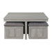 The Uster Coffee Table with Four Storage Stools is the perfect living room set for casual entertaining. The set includes a coffee table and four stools that you can tuck neatly beneath the table. It is constructed in solid woods, 3D paper, and finished in a weathered grey. The stools can be used as a foot rest, additional storage, or extra seating for guest. The Uster Coffee Table with Four Storage Stools features functionality and design. Pair it with the Uster End Table to create a very cohesive and completed look!
