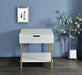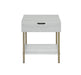 Mid-Century Modern elegance in a table for a living room or bedroom. The Whitman End Table has a the look and feel of a weathered white antique complemented by champagne tubular legs. A bottom shelf adds display or storage space to any room and the pull-out drawer is a handy place for remotes or electronics. The drawer slot offers a handy and clean look to a great item for a Side Table or Nightstand.