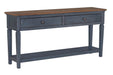The Americana 60 inch Sofa Table boasts a refreshing coastal twist on traditional style. Skillfully crafted from Rubberwood Solids and Birch Veneers, the subtle distressing and Corduroy Blue finish give this Entry Table an updated look with a timeless heirloom feel. Featuring two drawers and one lower shelf, this Console Table is the ideal spot to showcase a table lamp and home décor favorites whether placed behind your sofa or in your entryway. Just like Baseball, Apple Pie and Rock & Roll, the Americana Sofa Table will become a beloved favorite in your home. Fully assembled upon arrival, this piece from Bridgevine Home is ready to unbox and enjoy.