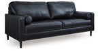 This sofa embodies timeless mid-century elegance with its linear design, sleek track arms and tapered legs. Genuine leather in the seating area adds a luxurious touch to the overall look. Experience endless style opportunities for today's living spaces.