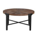 The Chevron 36-inch round coffee table masterfully blends modern minimalism with rustic elements in a mixed media centerpiece for a warm and cozy living room. An ideal choice for contemporary spaces, its sleek, round shape and modest size are perfect for smaller living areas, ensuring functionality without overwhelming the space. The table's top, crafted from elm, Acacia, and other veneers, is finished in a natural cinnamon shade, highlighting the wood's grain and knots. This hand-stained finish adds a rustic charm, contrasting with the modern, black-coated iron base. The round shape works great with sectionals or sofa and loveseat sets.