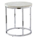 - Styling details include soft round shapes with white marble tops and chrome bases give tables a soft contemporary feel that will add sparkle to any room
