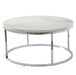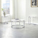 - Styling details include soft round shapes with white marble tops and chrome bases give tables a soft contemporary feel that will add sparkle to any room