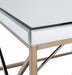The Evelyn set offers modern elegance with its geometric base design and boxed mirrored top. You will enjoy how the light bounces off the table top and apron Rail to create a larger more vibrant space. The mirrored table also features a sturdy iron base that is finished with a unique copper chrome.