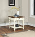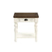 Add farmhouse charm to your living area with the Joanna End Table. Gracefully turned legs combine with a two-tone ivory and mocha finish for an inviting look that works well with any farmhouse or cottage upholstery. A working drawer with half-moon nickel hardware adds hidden storage to any room while the units's bottom shelf adds storage and/or display area. Matching Sofa Bar and dining sets are available from this comprehensive farmhouse collection.