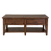 Warm and cozy. Bring beauty indoors with the casual country style Lake House three-piece set, consisting of a cocktail table and two end tables. Crafted of poplar solids and oak veneers, this set features planked tops, wood and peg accents, tapered legs, and is accented with antique brass knob hardware. The cocktail and end tables both offer bottom shelves for additional storage. The cocktail table has two push through drawers that can be accessed from either side, as well as casters for easy mobility. The end table has one drawer of storage. The golden oak finish allows for a universal appeal.