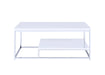 A contemporary collection of tables featuring chrome bases and white tops. An asymmetrical bottom shelf adds function as well as style to the collection and the Silvershield® top adds beauty and texture to the cocktail and end table.