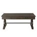 The Stone Coffee Table makes it easy to stay stylish without losing functionality! This rectangle accent table features trestle legs, adding extra design to this already stunning piece. The coffee table comes with one drawer, to keep your remotes properly stored away. The metal drawer pull is finished in a dark pewter, complementing the dark ash finish of this coffee table. The transitional design ensures this will be a staple in your home for years to come.