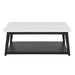 Elements of Mid-Century Modern and Scandinavian Contemporary combine in this casual yet elegant Cocktail Table. Clean lines and a natural black finish add a contrasting black and white look that blends beautifully with neutral interiors. A castered bottom means easy mobility to easily move the table away from reclining upholstery or out of the way for cleaning. The bottom shelf comes in handy for storage or display. Wrap it all up in one package for a great centerpiece to a lovely living room setup.