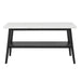 - Styling details include knife edge marble top, canted solid wood legs and bottom shelf for storage or display