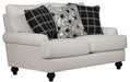 Cumberland is a Farmhouse Casual group with a stylish mix of fabrics and texture. A transitional sock arm, turned wooden legs in a rich finish, and LAUGH-LIVE-LOVE emoji toss pillow complete the look.