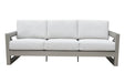 Neutral contemporary style in an outdoor set that will make your patio a showcase. This Sofa looks like it was sculpted for the great outdoors with beveled end panels that frame a modern geometric pattern. And although it looks like an indoor upholstery set, this group is built for the outdoors with rust resistant aluminum frames, solution- dyed acrylics and fast-drying foam cushions.
