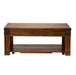 Simple, modern design elements with an industrial flair are found in the Arusha Occasional Collection. The lift-top cocktail table is sturdily constructed of hardwood solids and mango veneers in a beautiful medium cherry finish with metal bracket accents. The spring lift table top offers a smooth and controlled open and close and reveals two storage spaces underneath. The perfect place to hide the remote! The bottom shelf can be used for extra storage or display. Hidden casters provide easy mobility so you can easily place this functional table according to your needs. Also available in this collection are the end table and sofa table (purchase separately). Your purchase includes one lift-top cocktail table.