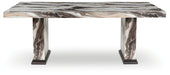 | Details | Includes dining table top and base, Made with solid hardwood, decorative paper laminate and MDF substrate, Tabletop and double pedestal base with replicated marble pattern; polyester topcoat for lasting beauty, Seats up to 8, Assembly required | |