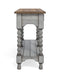 - Distressed graywash finish with medium brown top provide a well-worn and cozy aesthetic