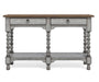 Use as a stand-alone piece along a wall or accent a sofa or loveseat with the inviting look of the Plymouth sofa table with drawers. Featuring a planked top, two drawers with ball-bearing slides and an open lower shelf, this table offers plenty of storage and display area to showcase your most treasured photos and décor. A weathered graywash finish is enhanced by the medium brown table top, while spool-turned legs and gunmetal pulls add cottage-inspired warmth and character.