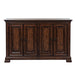 Armand, inspired by a 17 century French antique. Pulling in Tuscan elements for the dining the rectangular trestle table features heavy square turned bases. Square back, armless upholstered chairs feature linen upholstery with a nail head trim on the base of the chair. The buffet features 4 door panels with overlays and pilasters chamfered for a soft appeal. Cases feature overlays on the top drawers, framed drawer panels, block feet and chamfered posts. Media features drop down fronts so it can double as a small dresser with the landscape mirror for smaller spaces.