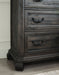 Warm and inviting like an old French friend, Bellamy welcomes with European inspired styling in a unique Peppercorn finish and matte black pewter accented hardware. Scrolling open woodwork adorns the well appointed media chest doors while roomy dressers and chests feature rounded corners atop rounded bun feet. A plethora of bed options offer upholstered tufted headboards, storage footboards, panel headboards and gorgeous shaped panels with or without sumptuous scrolled design work for a Chateau feel for any taste.